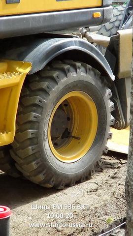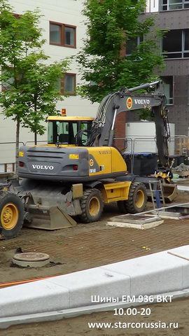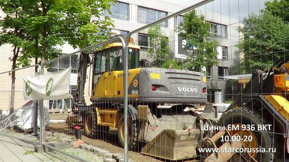 В данном случае мы заметили шины BKT EM 936 (EM 936 BKT Wheeled Excavator Tyres) на колесном экскаваторе Volvo EW160. Экскаватор выпускался фирмой Volvo Construction Equipment. Это не самая новая модель, да и с самой моделью не все понятно. Хотя на корпусе машины обозначена модель EW160, экскаватор имеет измененную стрелу и ходовую часть. Выбор марки экскаватора понятен — Швеция рядом.